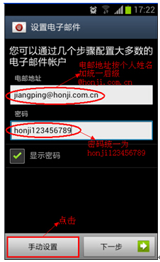 例如“江平”的邮件账户为“jiangping@honji.com.cn”,“黄伟俊”的电子账户为“weijun@honji.com.cn”,然后点击【手动设置】