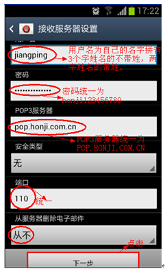 这里服务器地址统一为POP.HONJI.COM.CN(不分大小写)。安全无,端口110,从服务器删除邮件选从不,然后点击【下一步】