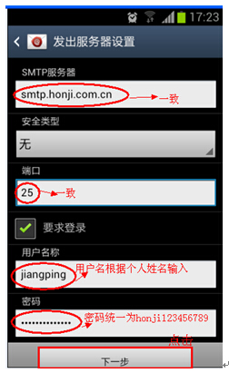 7. 服务器地址统一为SMTP.HONJI.COM.CN,端口25,用户名为自己名字不带姓(如果姓名为两字的需带姓)的小写拼音,例如江平为jiangping。黄伟俊为weijun 密码统一为honji123456789,密码可在web版本上改。然后点击【下一步】。