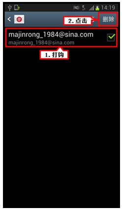 5.将需要删除的电子邮件账户打钩,然后点击屏幕右上角的【删除】
